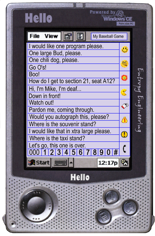 eHello is a hardware/software/internet solution to enable a speech-impaired individual to easily deal with the hearing world. A small Personal Digital Assistant (PDA) holds thousands of simple phrases. This small PDA contains a speaker. By simply pointing and clicking, the user instructs the PDA to “speak.”